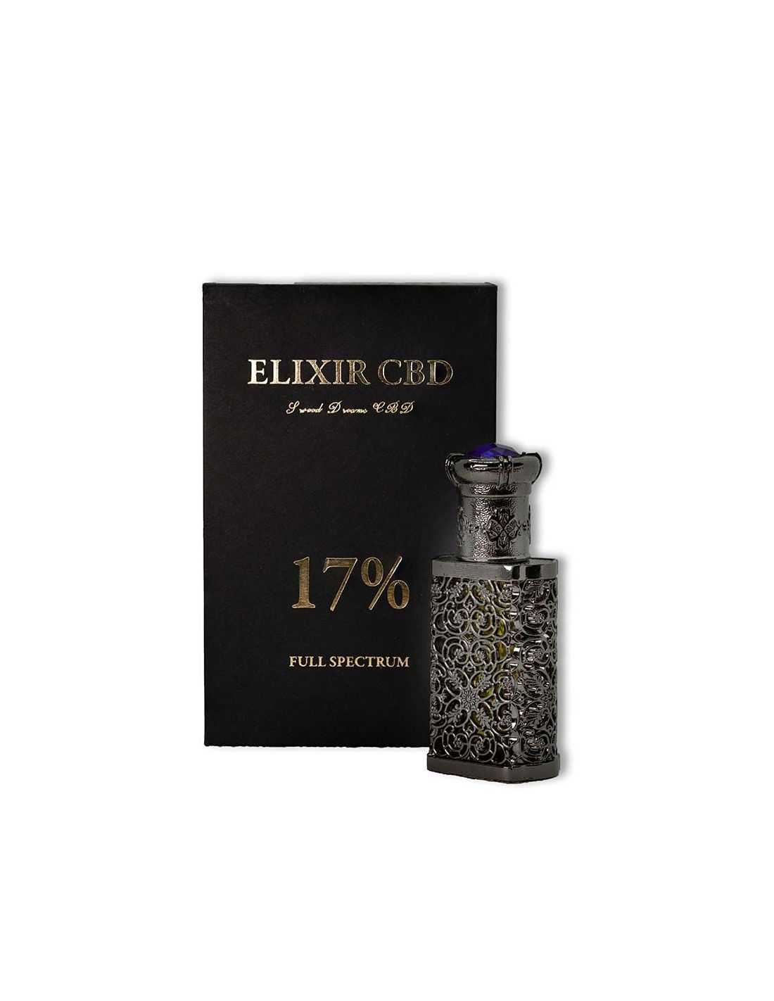 Aceite de de CBD al 17% Full Spectrum con aceite de oliva virgen extra. 100% de origen vegetal y presentado en botella de metal tallada y elegante estuche presentación negro.