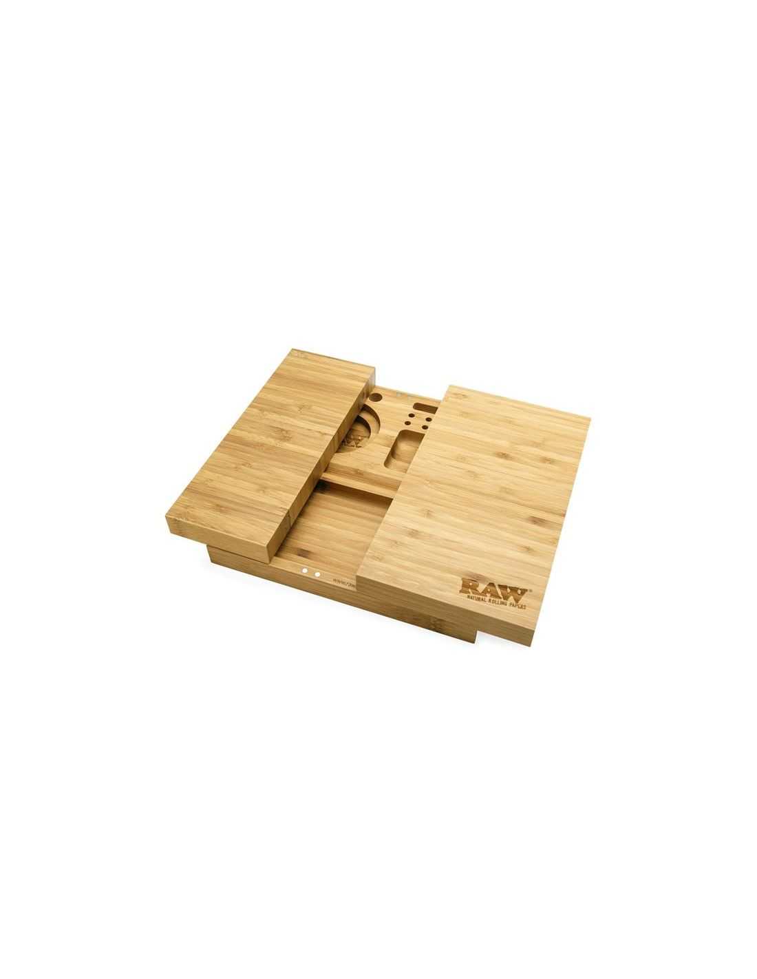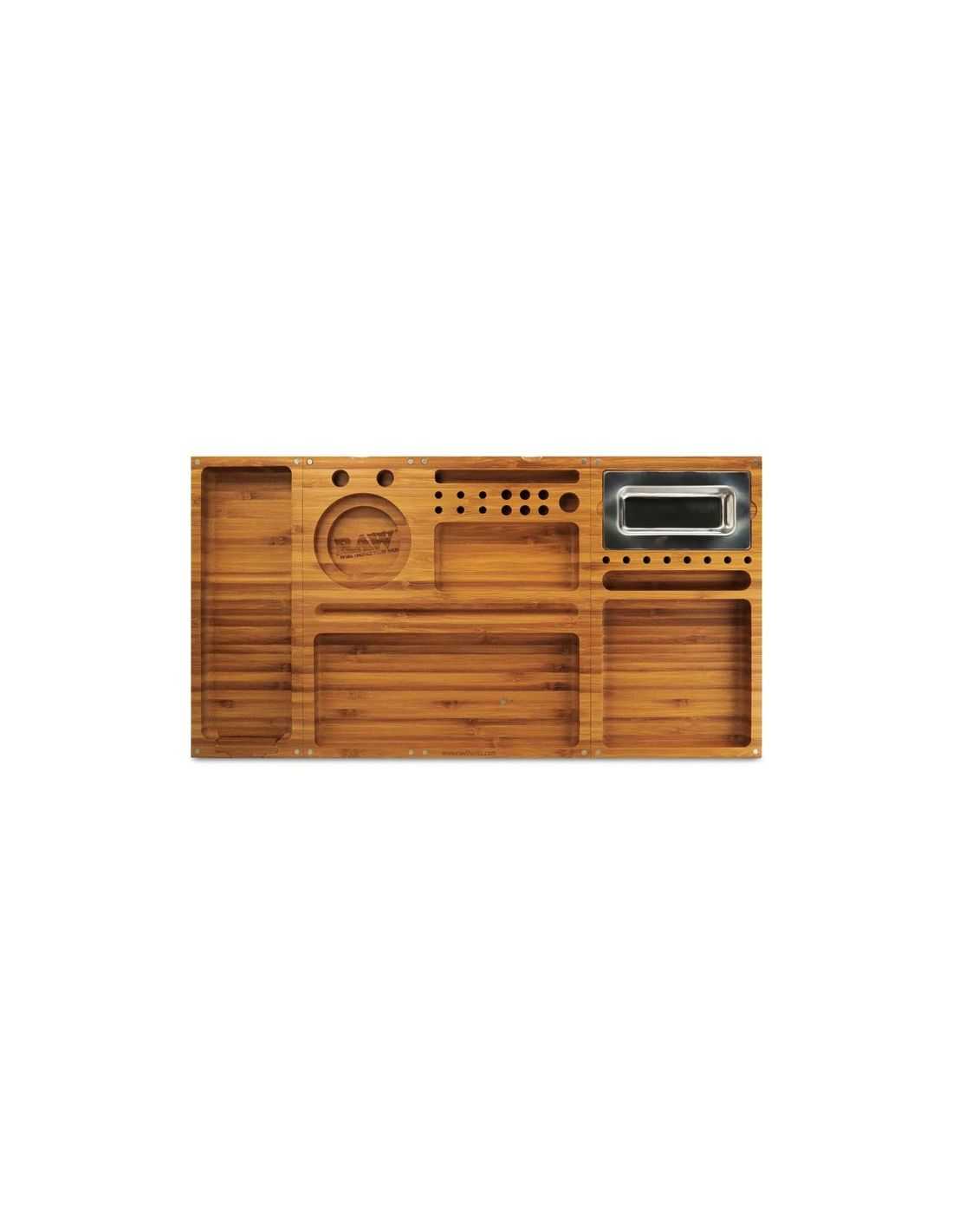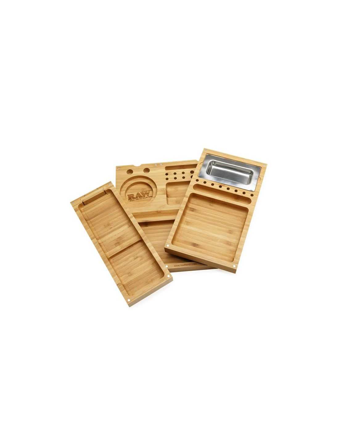 La bandeja Triple Flip es la más completa del mercado sin duda, resuelve todas las necesidades para fumar en grupo y resuelve de una forma ingeniosa que una vez acabes se pliega formando una elegante y decorativa caja de madera con el logo Raw grabado en la tapa.