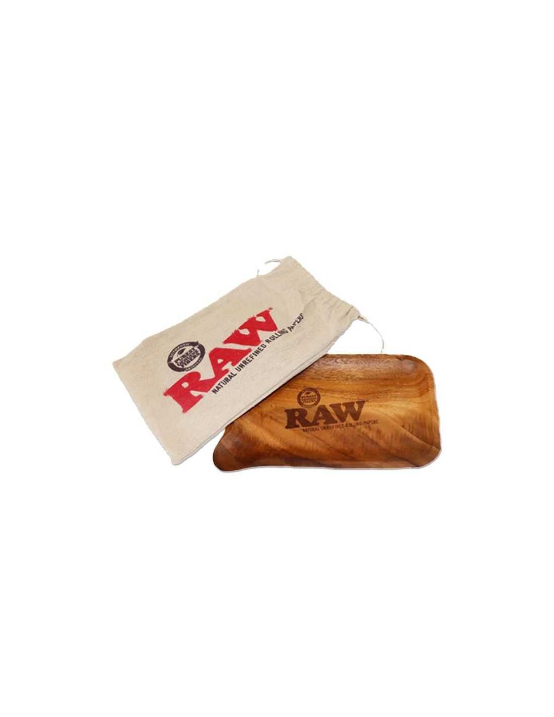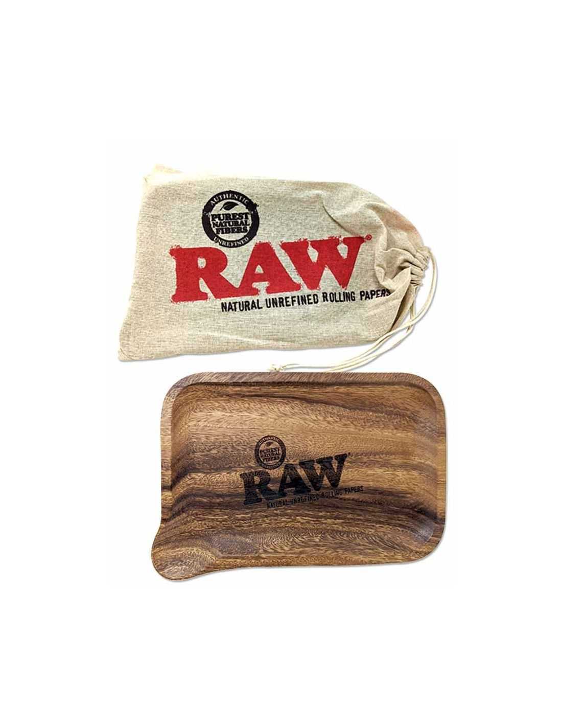 Nueva bandeja de madera Raw Spout fabricada en madera de acacia. Una de las esquinas forma un canal para echar la mezcla con total facilidad e incluye una bolsa de transporte de cáñamo con el logo de la marca.