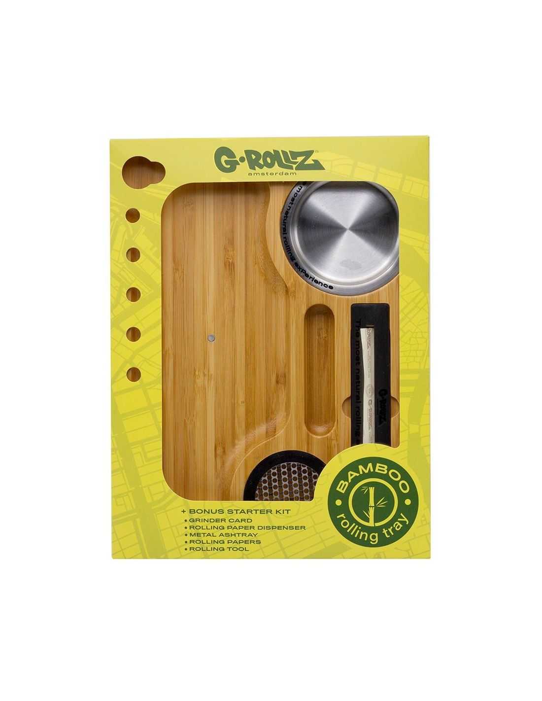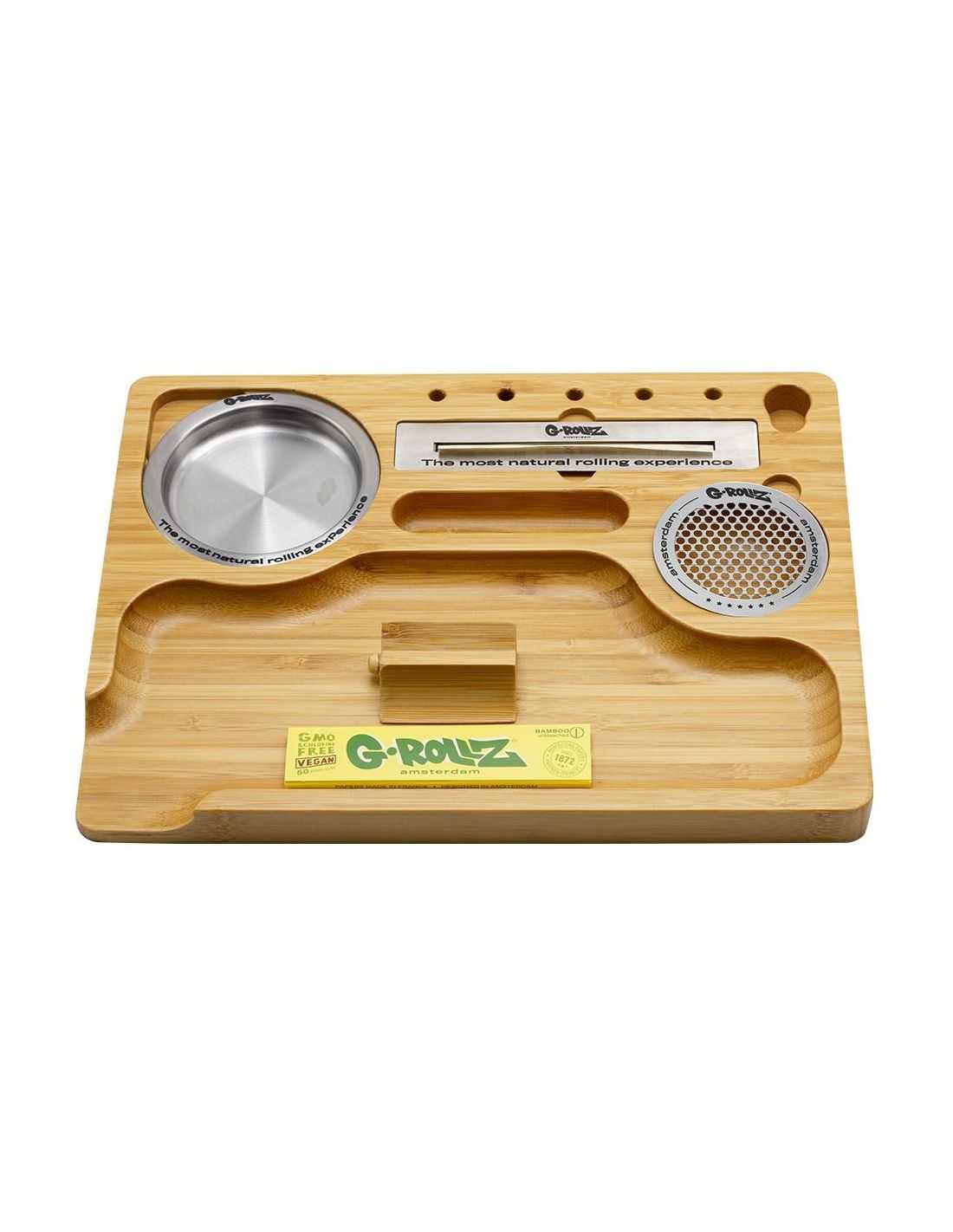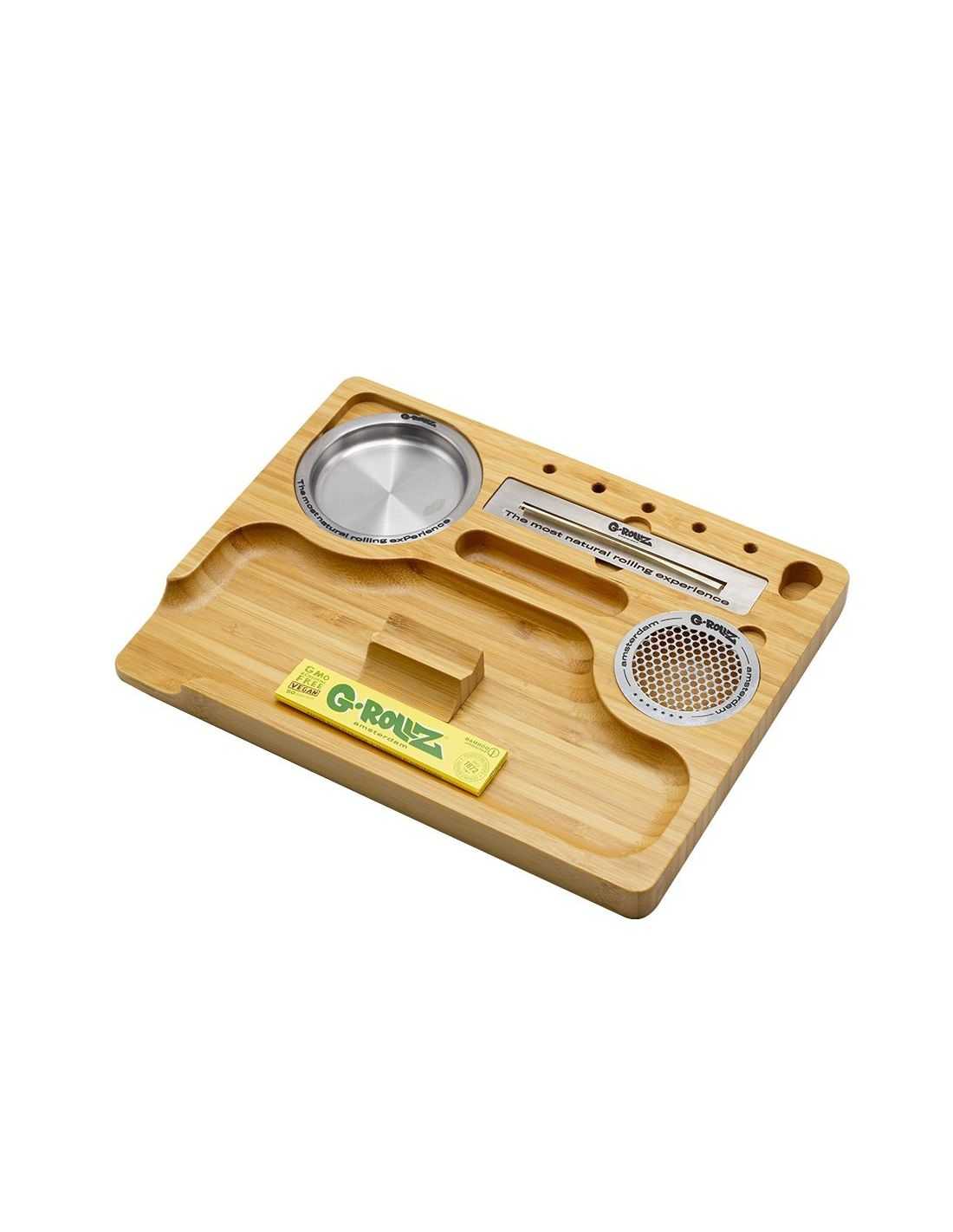 Tiene cinco ranuras talladas para filtros o porros, una ranura para tu encendedor, una tarjeta de grinder e incluso un cenicero. También viene con una herramienta de liar G-Rollz y papel de bambú.