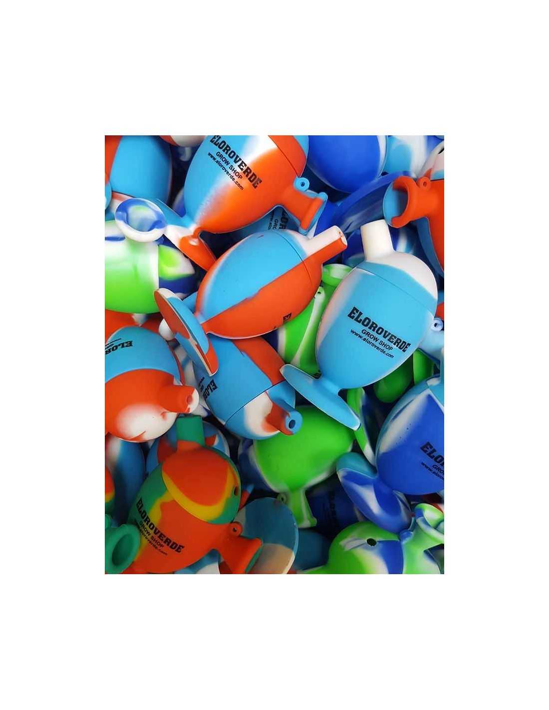 Mini bong de silicona con pie ventosa para fijar en una superficie lisa. Se le puede añadir agua, incluye orificio de regulación del aire y se desmonta en 2 partes para facilitar su limpieza.