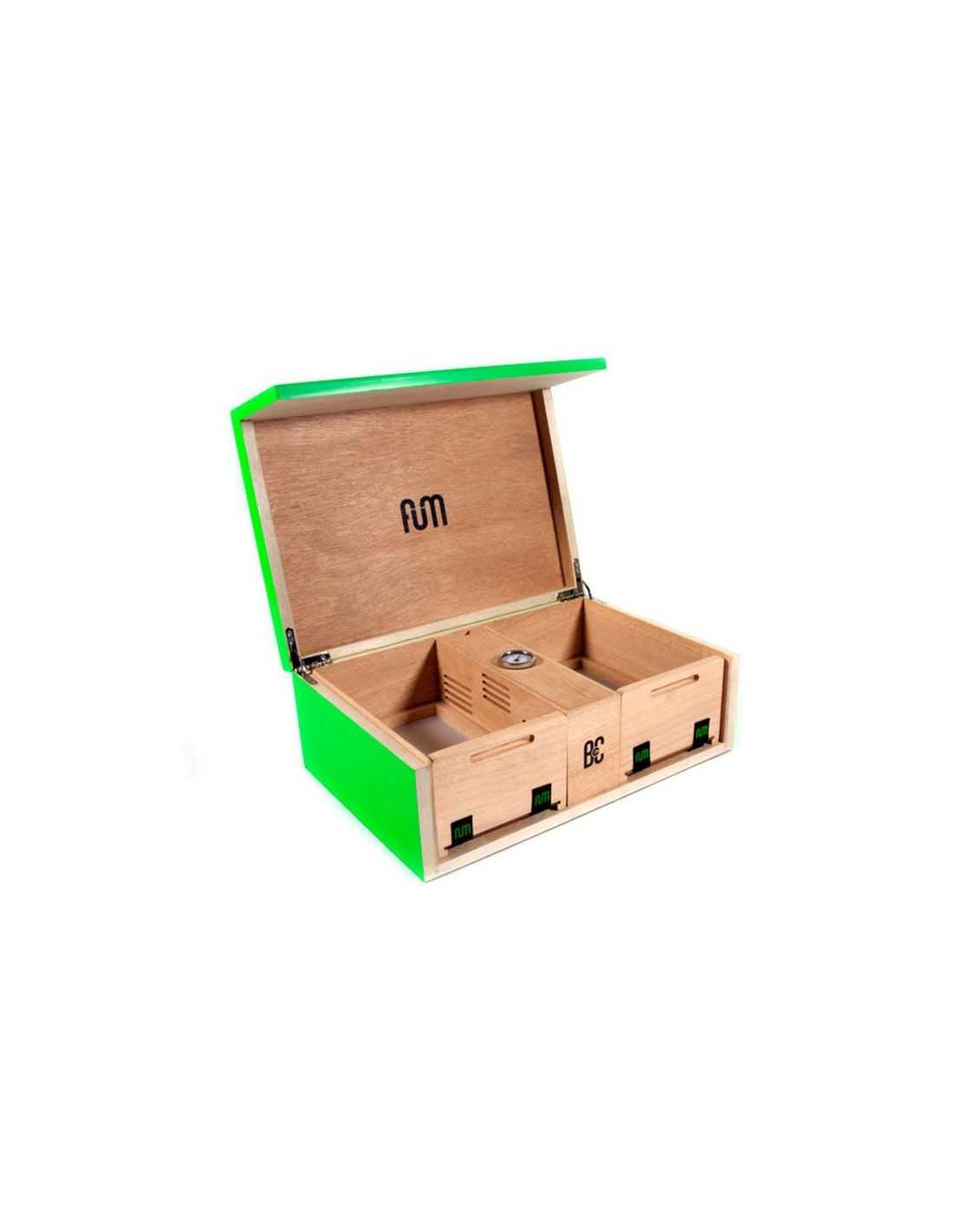 Sistema completo de curado y conservación de mesa diseñado específicamente para el cannabis. Interior en madera de okuma, cierre hermético, higrómetro y sistema interior de canalización del aire para controlar la humedad.