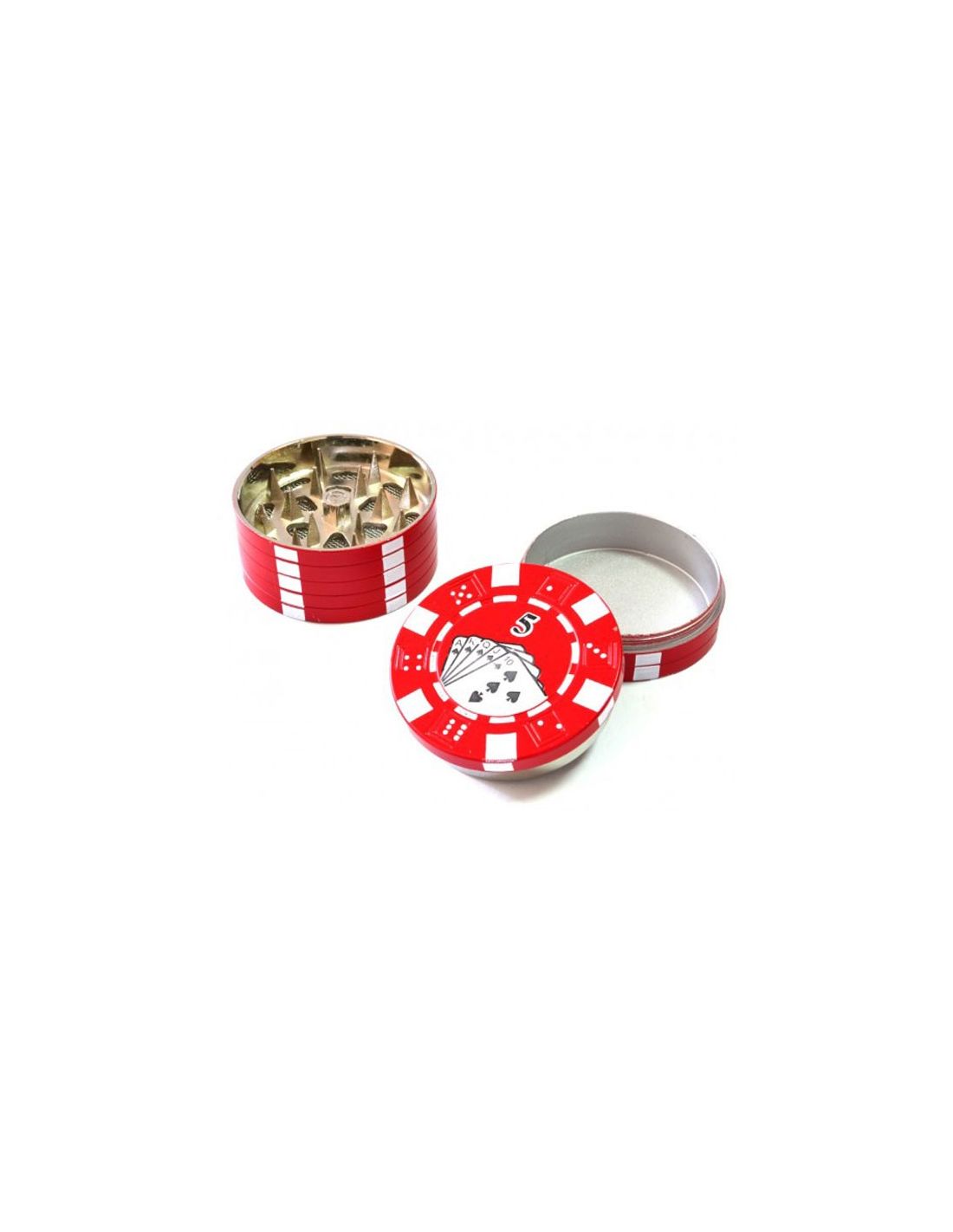 3 modelos diferentes de grinder de 3 piezas y 50 mm fabricado en aluminio imitando a una pila de fichas de pocker. Dientes piramidales para dejar la hierba de forma esponjosa para liar comodamente, cierre magnético y polinizador para recoger el polen o guardar la hierba.