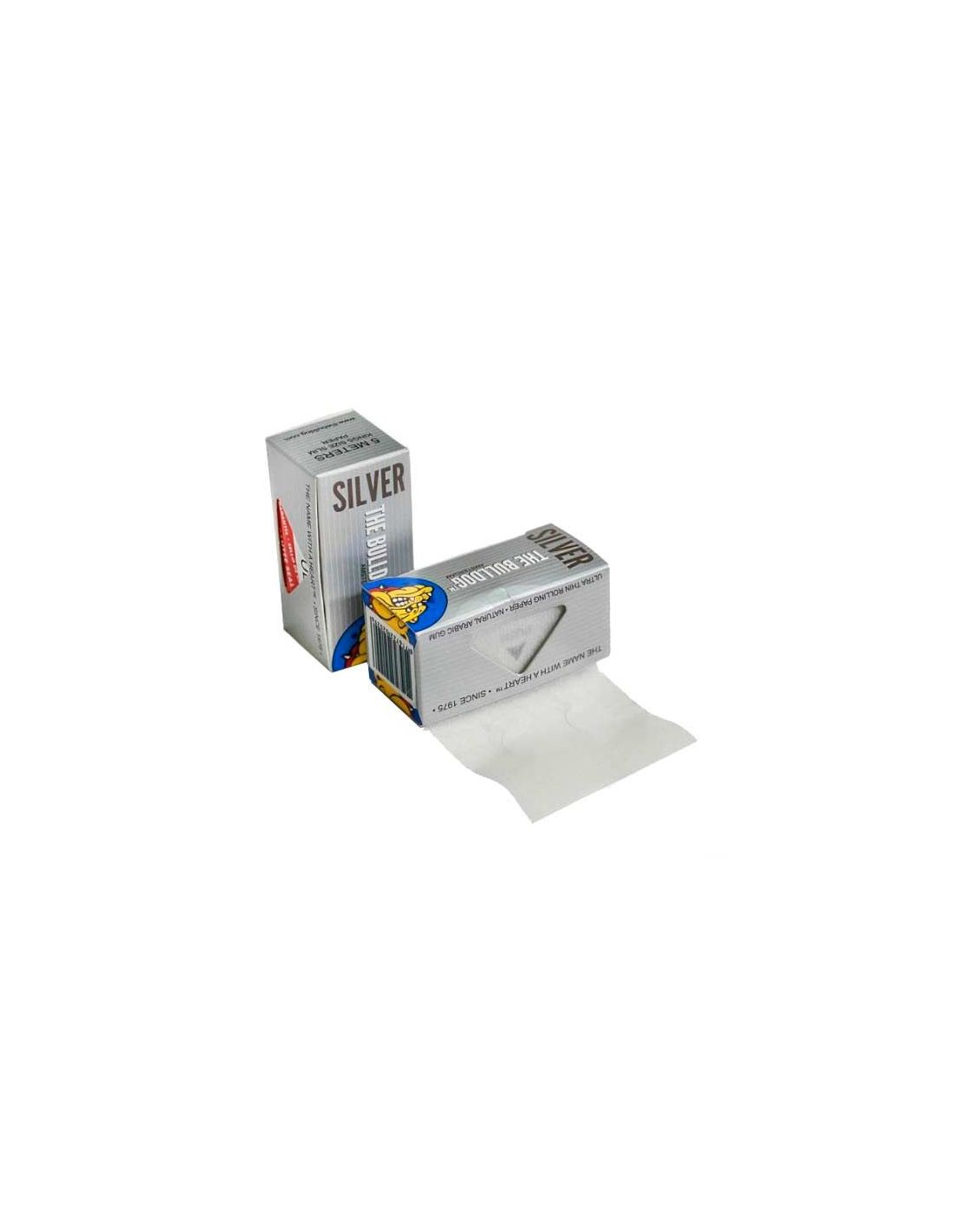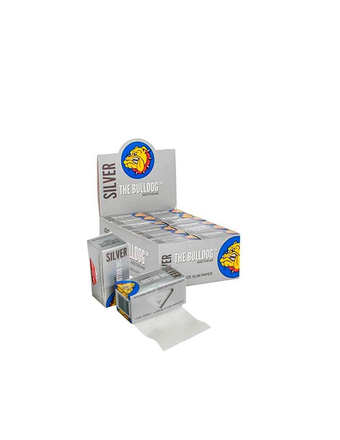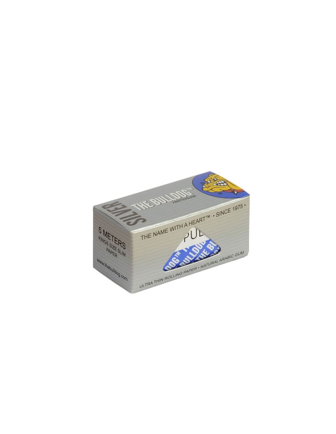 Rollo de papel de fumar Bulldog Silver Slim de 5 metros. El papel es ultra fino, está fabricado de celulosa y la goma es natural, el papel se desenrolla fácilmente por la ventana de la caja donde se corta a la medida deseada.